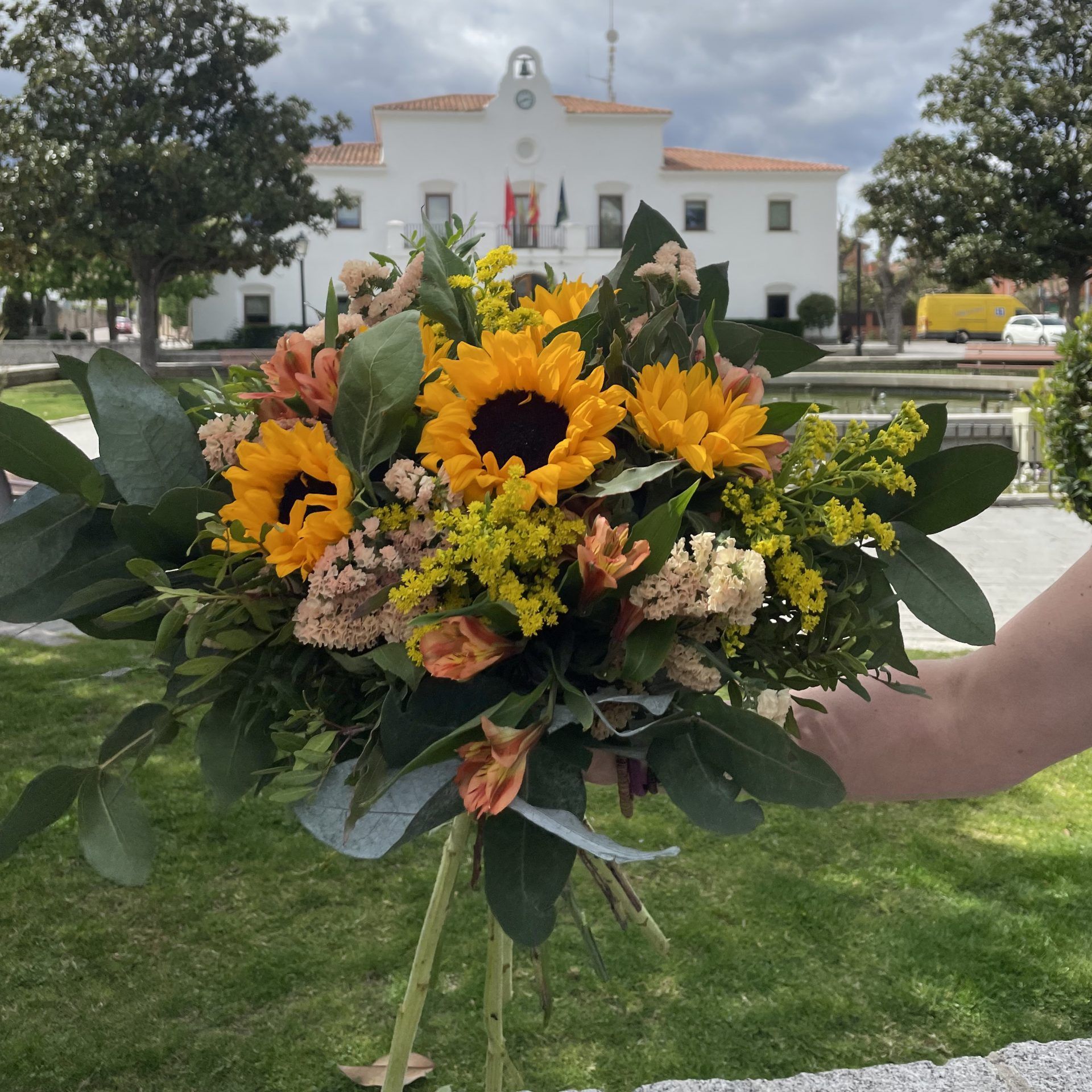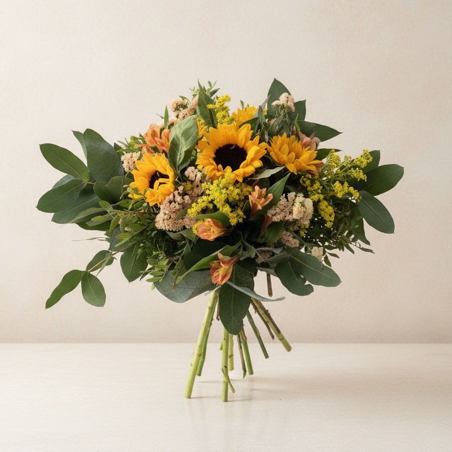 El solidago, también conocido como vara de oro, es una flor que añade un toque sutil y elegante al ramo. Con 3 ramas de solidago, este arreglo floral gana en textura y profundidad. Sus pequeñas flores amarillas complementan perfectamente el tono dorado de los girasoles, creando una armonía visual que cautiva a primera vista.
